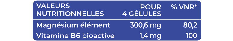 Ingrédients : bisglycinate de magnésium (1060 mg), malate de magnésium (420 mg), gélule d'origine végétale (pullulan), taurinate de magnésium (320 mg), vitamine B6 bioactive (pyridoxal-5-phosphate)